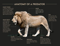 As long as a grown man’s index finger, a male lion’s canine teeth can easily crush the vertebrae of medium-size prey like zebra or wildebeest. Its front feet each have five retractable claws sharper than most kitchen knives. Another four on each of the rear paws give it the ability to latch onto its victim like Velcro to a cotton ball.