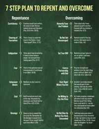 To help you develop these strategies, refer to the inset “7 Step Plan to Repent and Overcome.” It covers the seven steps toward repentance that are found in II Corinthians 7:11 and points to attitudes needed to begin changing. It also lists seven parallel steps toward overcoming from the article “You Can Overcome and Prevent Sin.” The inset includes specific actions you can take—think of the “fruits” and “works” John the Baptist and Paul spoke about.