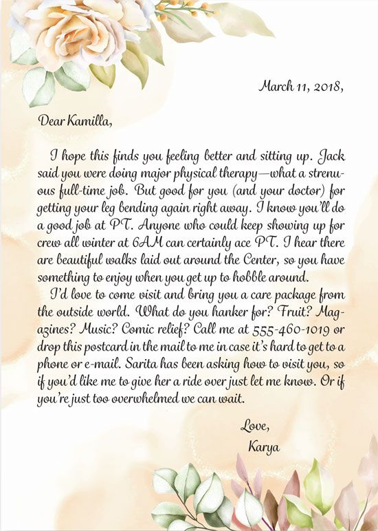 This example was adapted from the book The Art of the Personal Letter by Margaret Shepherd. A friend is writing to a patient undergoing long-term recovery from an accident, acknowledging the seriousness of the situation, focusing on the reader’s abilities, and offering specific help. She made it easier to reply by including a postcard.