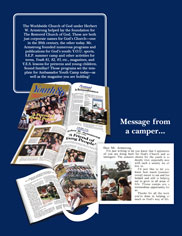 His ministry of reinforcing the bonds of the family unit and teaching the importance of recapturing true values continues today through Ambassador Youth Camp, Ambassador Youth magazine, and the vast library of literature, World to Come broadcasts, sermons, articles, reports, lessons, books and booklets produced by The Restored Church of God.